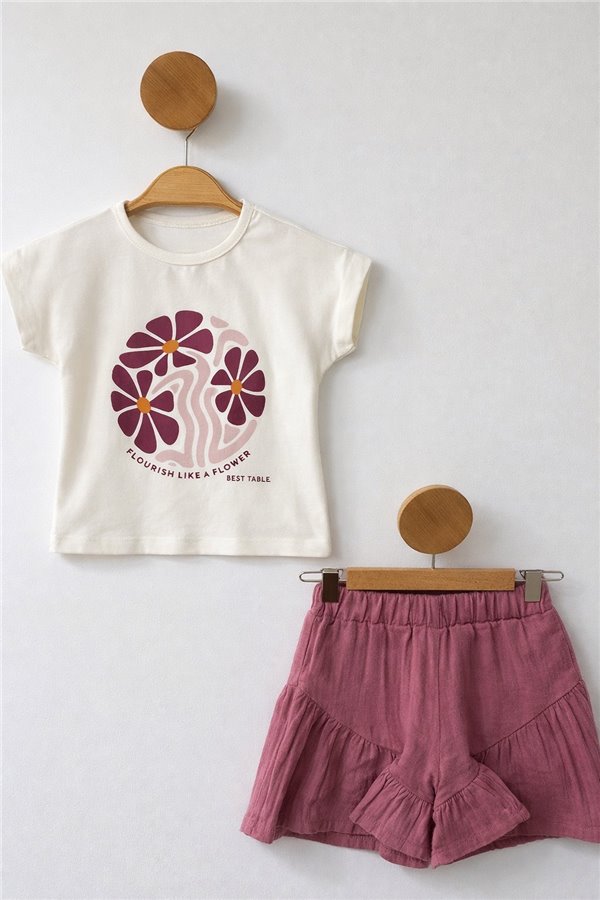 2-9 Yaş Yazlık Kız Çocuk Takım Çiçek Baskılı Gül Kurusu