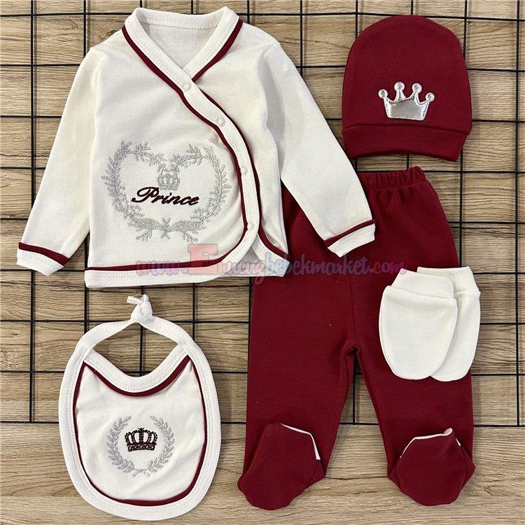 Gonca Bebe 0-3 Ay Prince Nakışlı 5 Parça Zıbın Takım Bordo