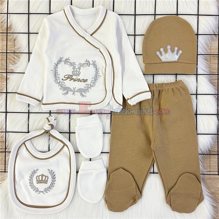 Gonca Bebe 0-3 Ay Prince Nakışlı 5 Parça Zıbın Takım Kahverengi