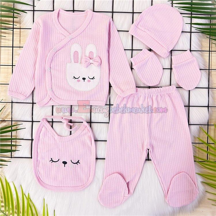 Gonca Bebe 0-3 Ay Tavşan Nakışlı 5 Parça Zıbın Takım Pembe