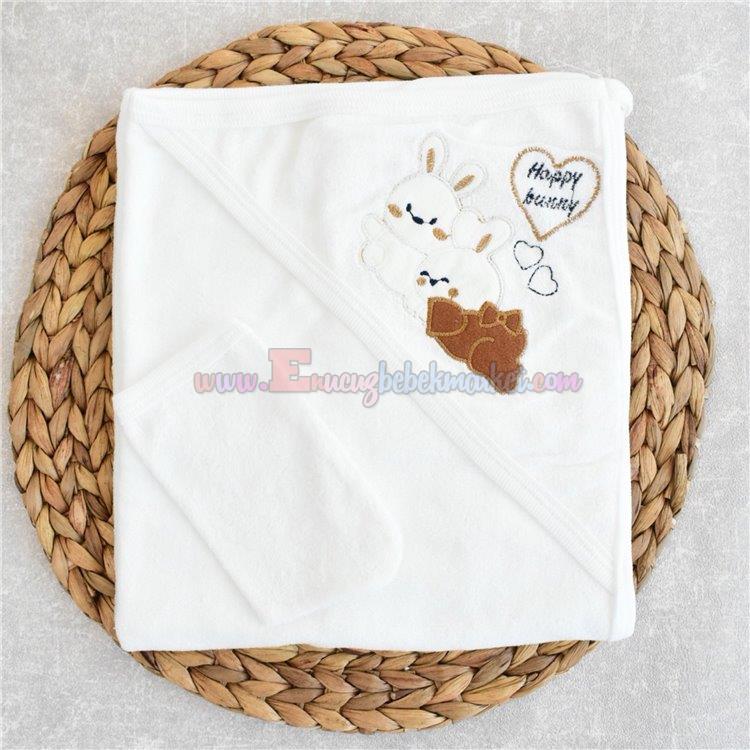 Gülünce 90X65 Cm Bebek Banyo Havlusu Tavşan Nakışlı Krem Kahve