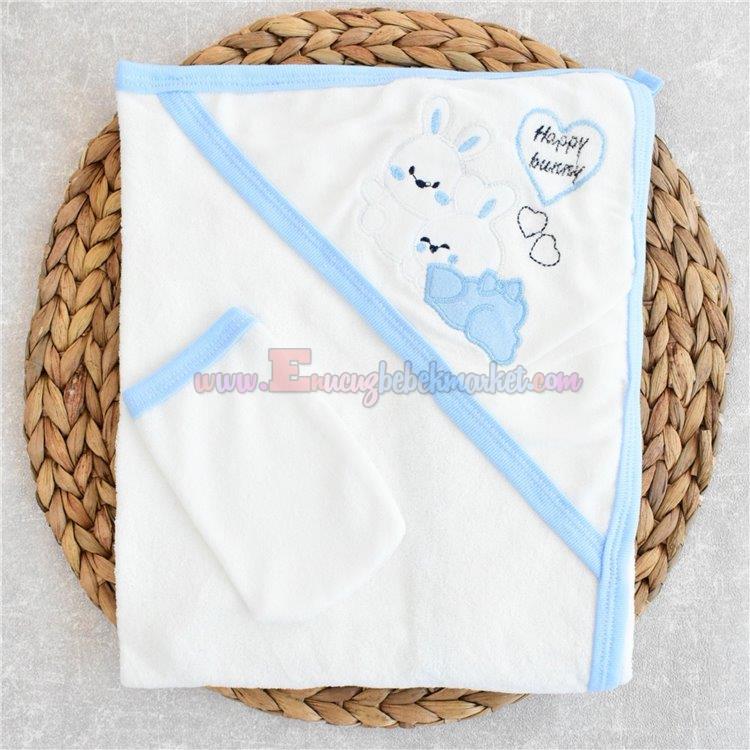 Gülünce 90X65 Cm Bebek Banyo Havlusu Tavşan Nakışlı Mavi