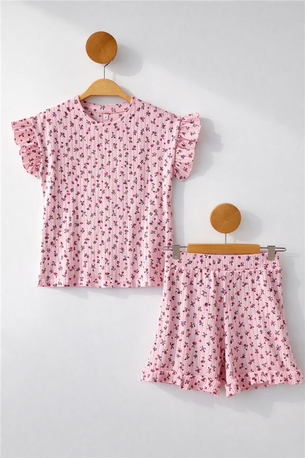 2-9 Yaş Yazlık Kız Çocuk Takım Fiyonk Baskılı Pudra
