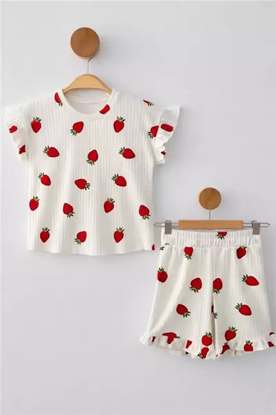 Kız Çocuk 4-7 Yaş Çilekli Fırfırlı Takım Kırmızı Beyaz