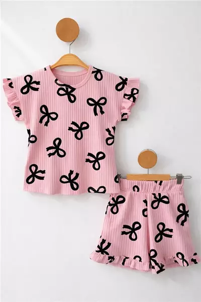 Kız Çocuk 4-7 Yaş Fiyonklu Fırfırlı Takım Pembe