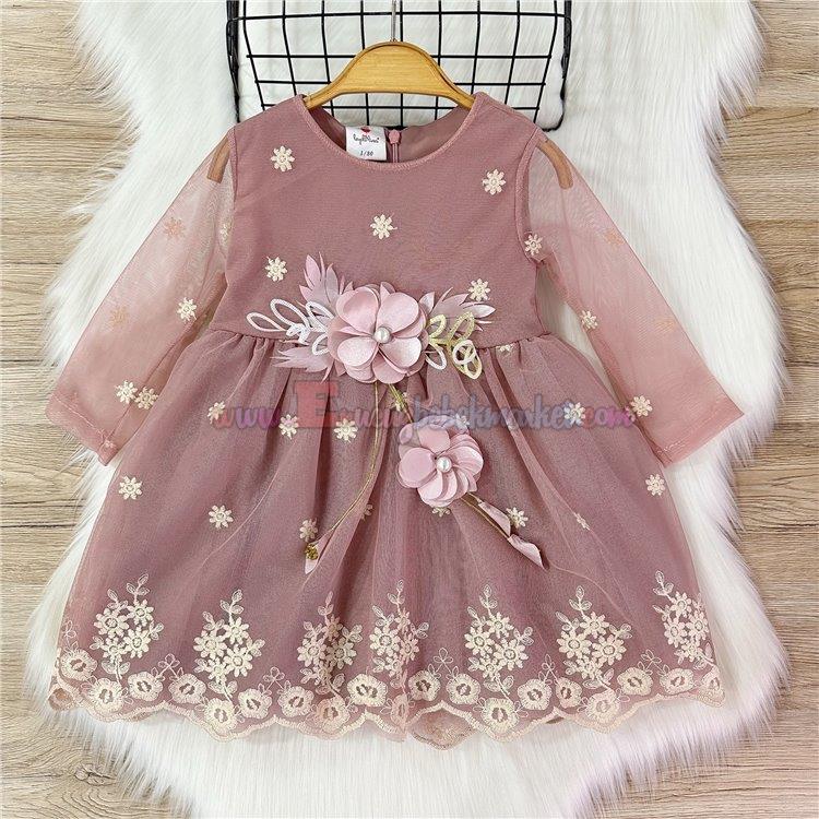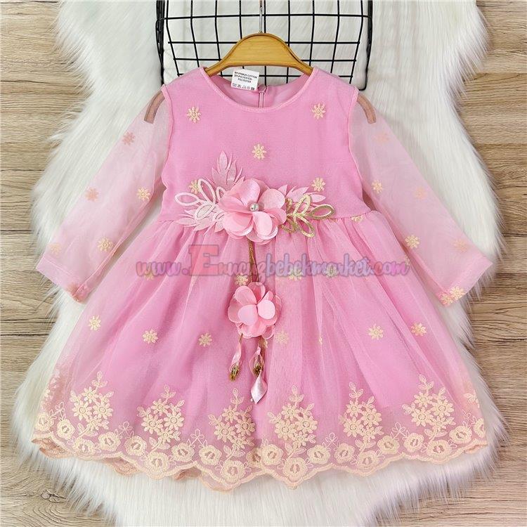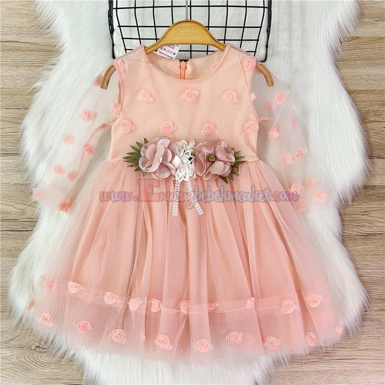 Leydi Lina 1-2-3 Yaş Gül Detaylı Tüllü Kız Elbise Kod 711 Somon