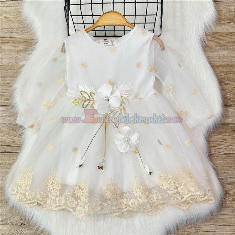 Leydi Lina 1-2-3 Yaş Güpür Detaylı Tüllü Kız Elbise Kod 713 Krem