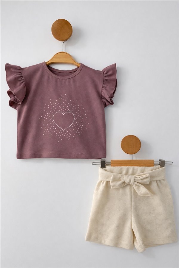 Mina 2-5 Yaş Taşlı Jakarlı Müslin Şortlu Kız Çocuk Takım Pudra
