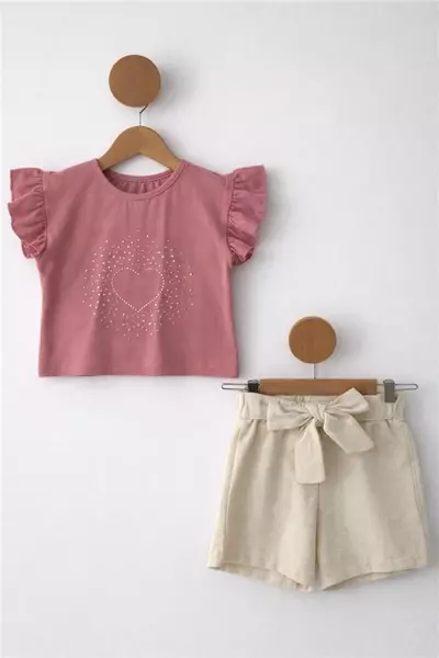 Mina 2-5 Yaş Müslin Şortlu Çiçek Baskılı Kız Çocuk Takım Gül Kurusu