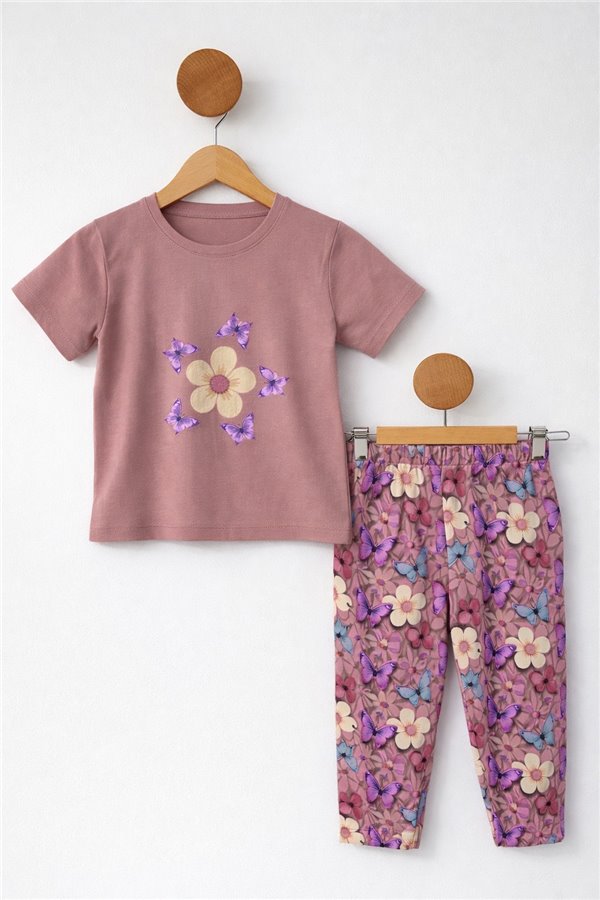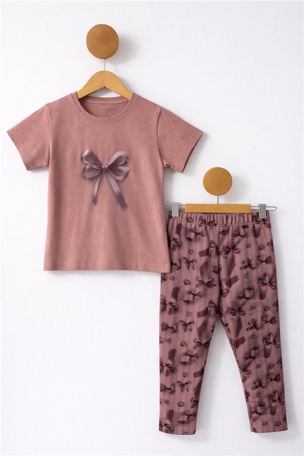 2-9 Yaş Yazlık Kız Çocuk Takım Fiyonk Baskılı Gül Kurusu