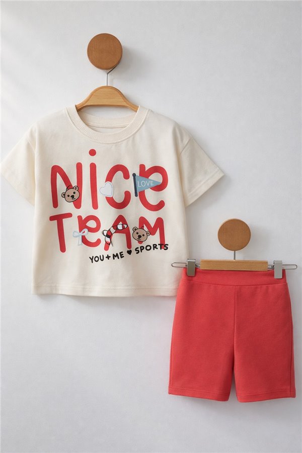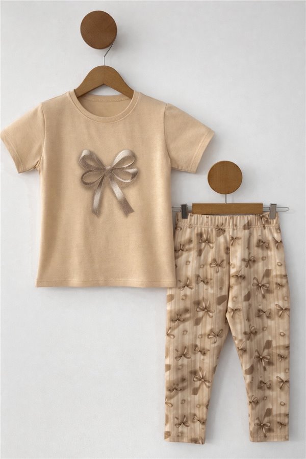 2-9 Yaş Yazlık Kız Çocuk Takım Fiyonk Baskılı Bej