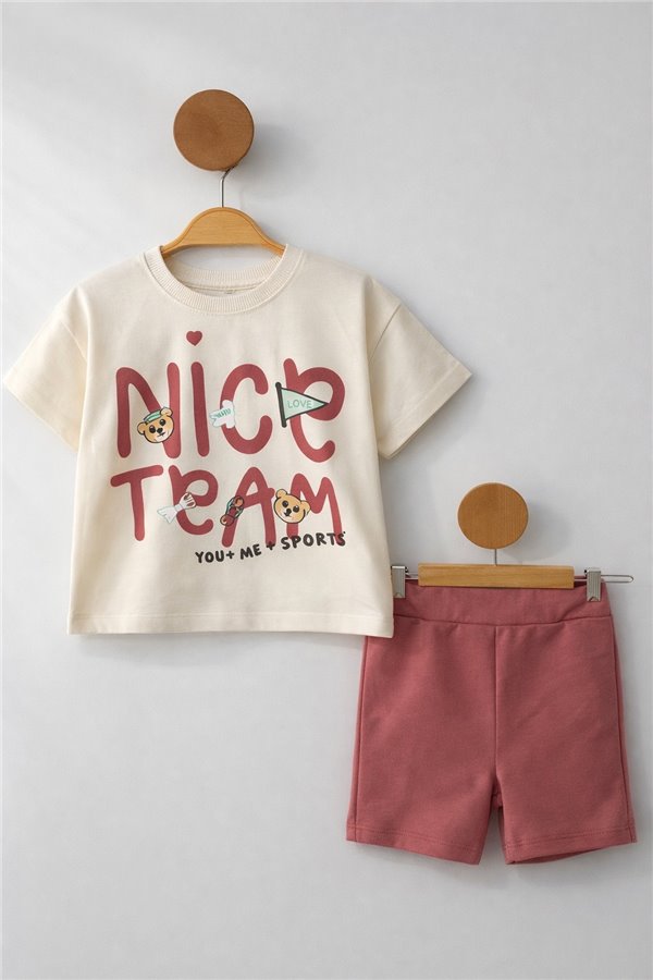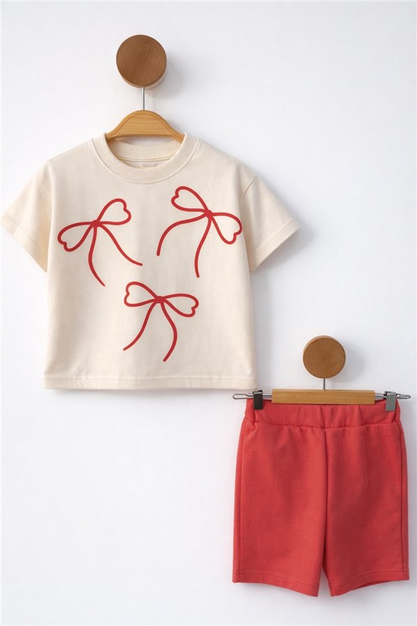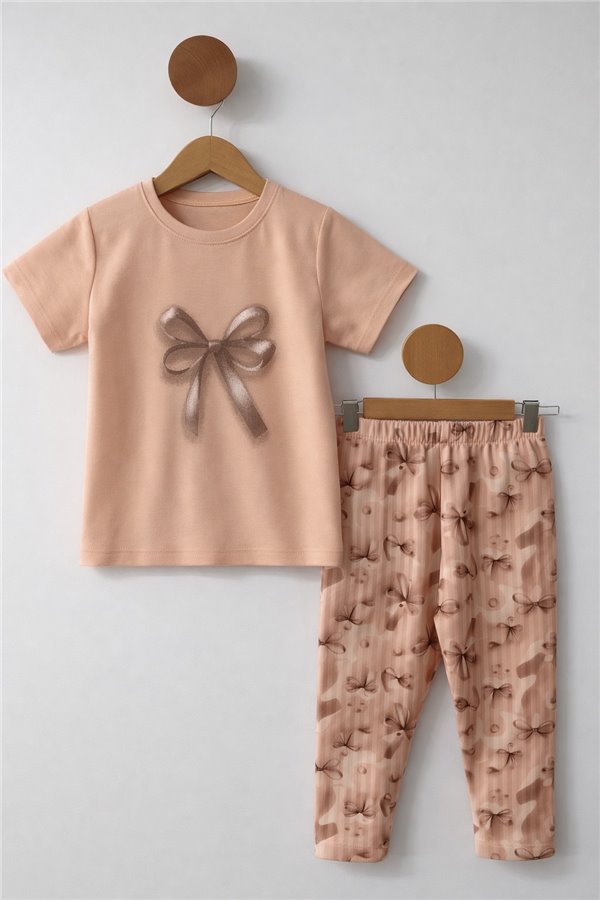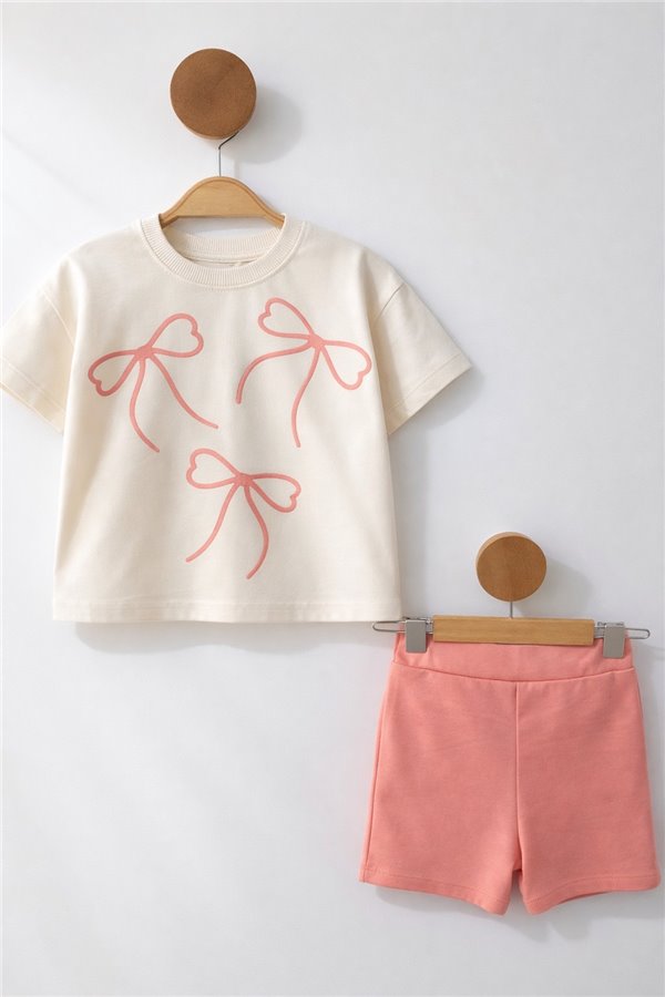 2-9 Yaş Yazlık Kız Çocuk Takım Fiyonk Baskılı Pudra