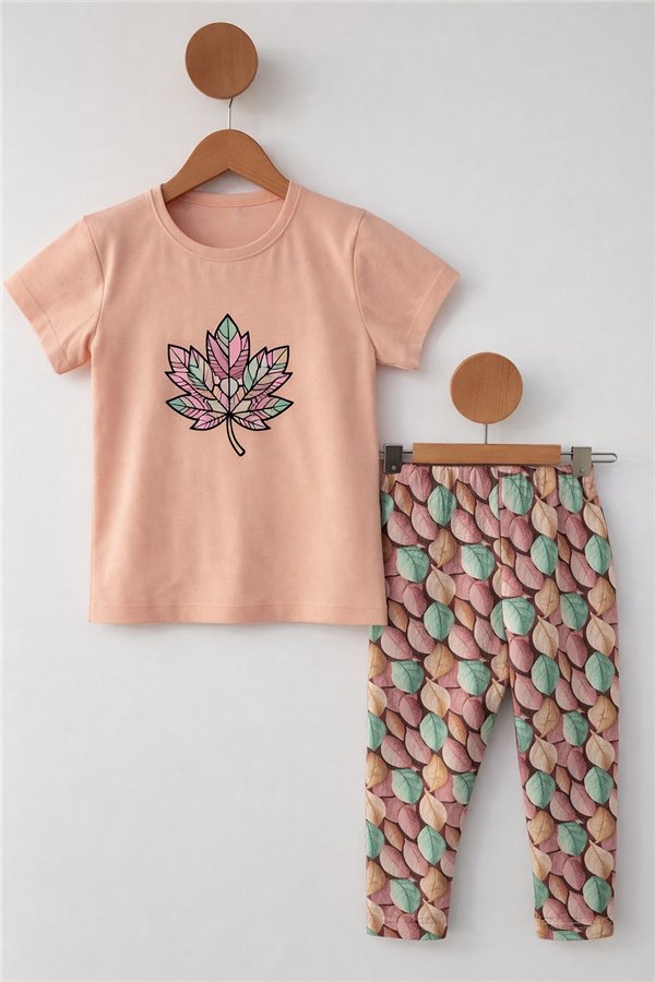 2-9 Yaş Yazlık Kız Çocuk Takım Yaprak Baskılı Pudra