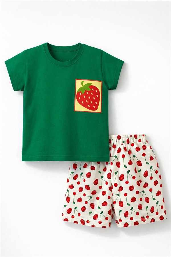 3-7 Yaş Çilek Baskılı Kız Çocuk Takım Yeşil