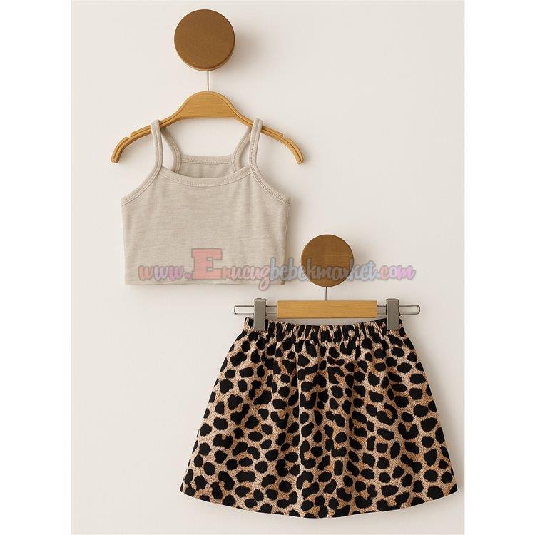 Deco Kids 3-7 Yaş İp Askılı Crop ve Leopar Etekli Kız Takım Bej