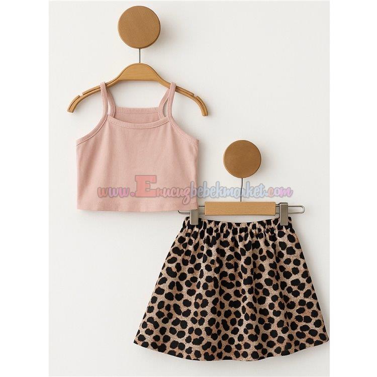 Deco Kids 3-7 Yaş İp Askılı Crop ve Leopar Etekli Kız Takım Pudra