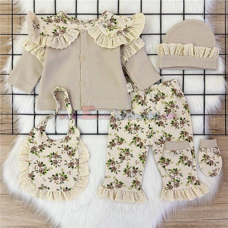 Minicayzen 0-3 Ay Çiçekli Waffle 5 Parça Zıbın Takım Bej