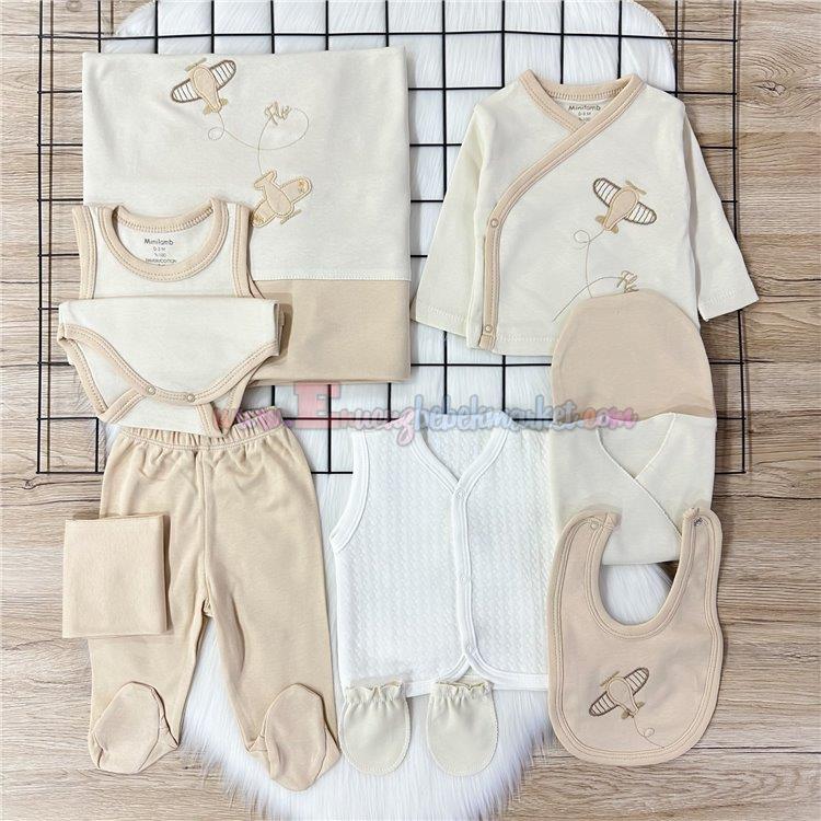 Minilamb 0-3 Ay Uçak Nakışlı 10 Parça Zıbın Seti Bej