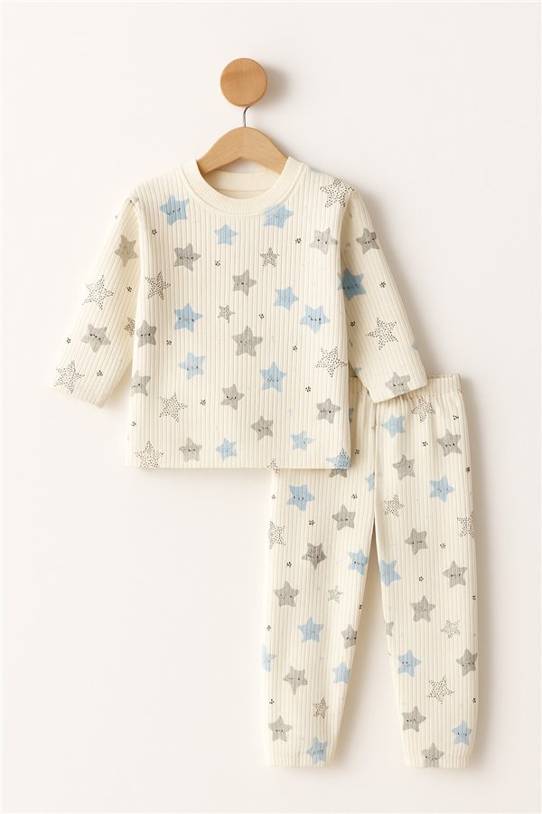 Özlv 9-12-18-24 Ay Yıldızlı Desenli Bebek Pijama Takım Mavi