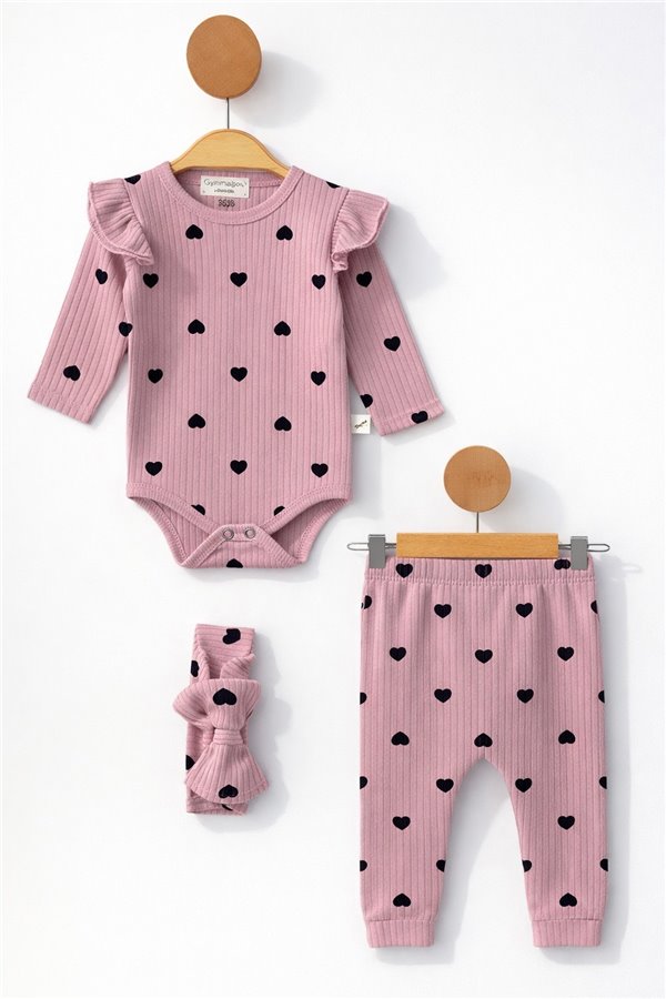 Mrt Baby 0-3-6-9-12 Ay Kalp Baskılı Kız Bebek Takım Gül Kurusu