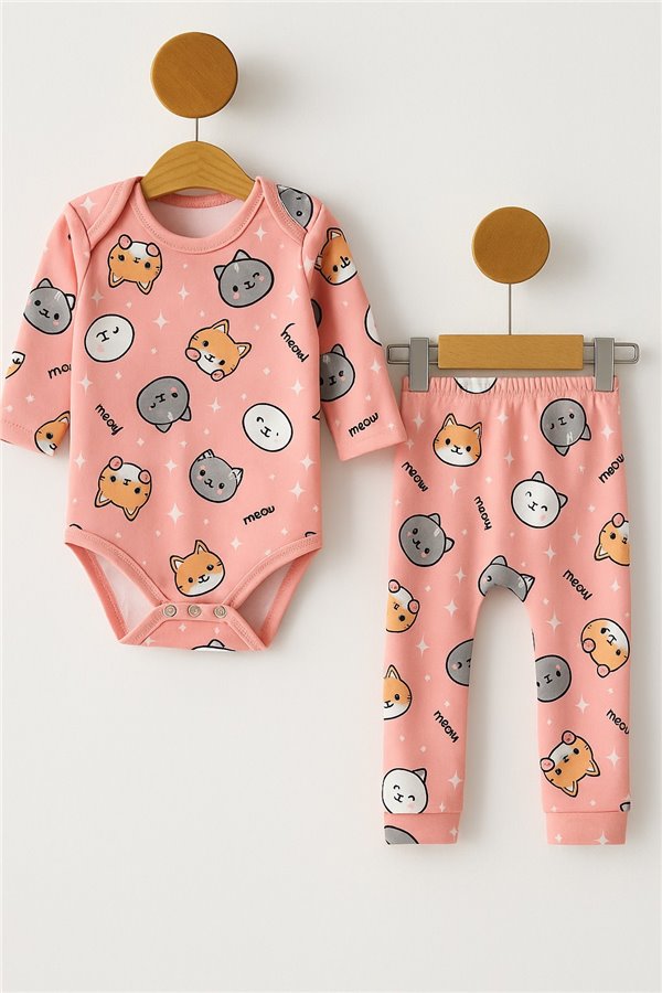 Süpermini 0-3-6-9 Ay Kedi Baskılı Bebek Takım