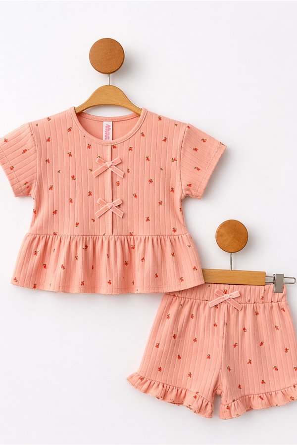 2-9 Yaş Yazlık Kız Çocuk Takım Fiyonk Baskılı Pudra
