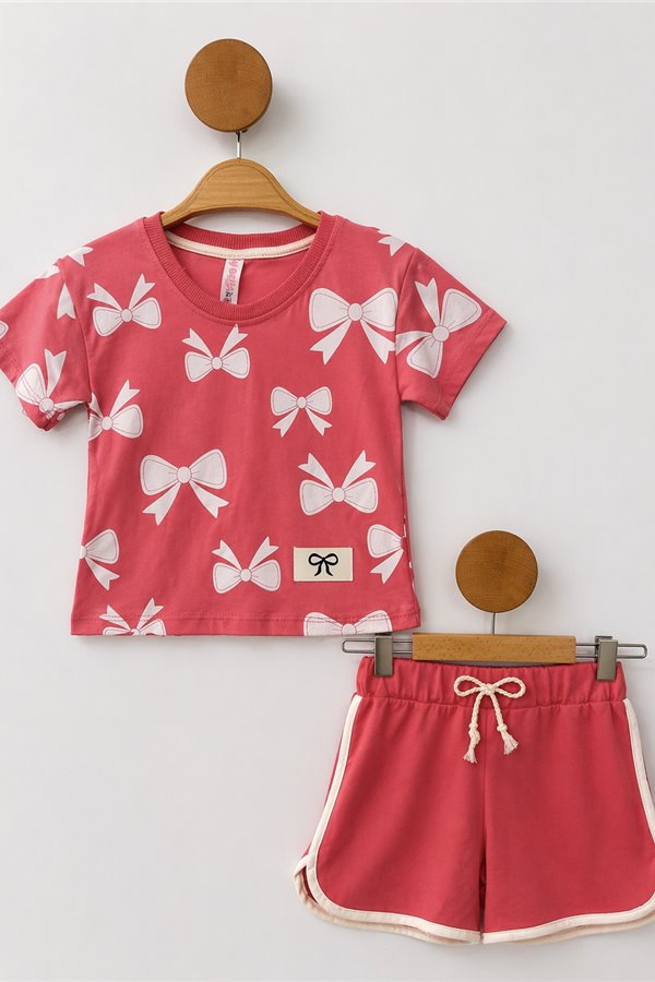 2-9 Yaş Yazlık Kız Çocuk Takım Fiyonk Baskılı Pudra