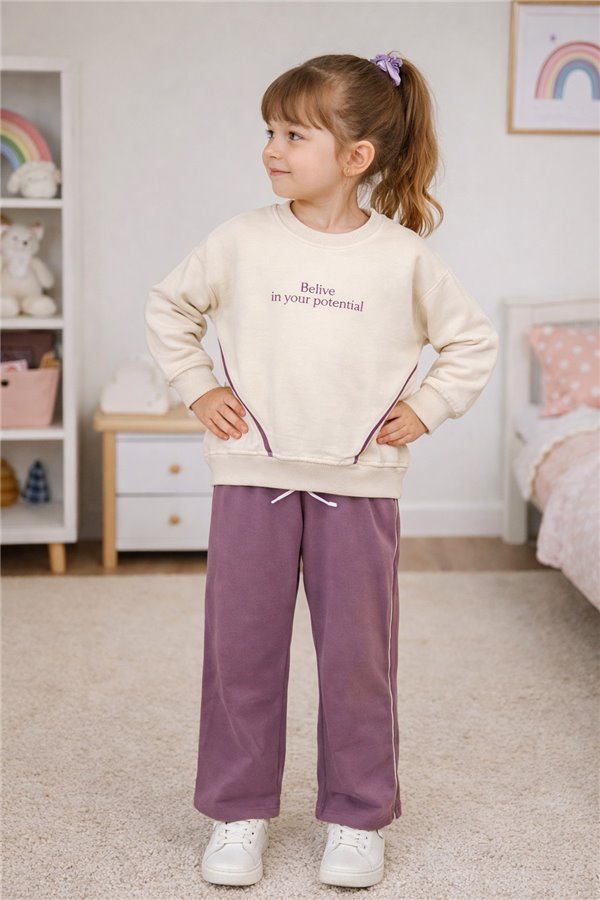 My Bella 2-5 Yaş Kız Çocuk Takım Yazı Baskılı Krem Mor