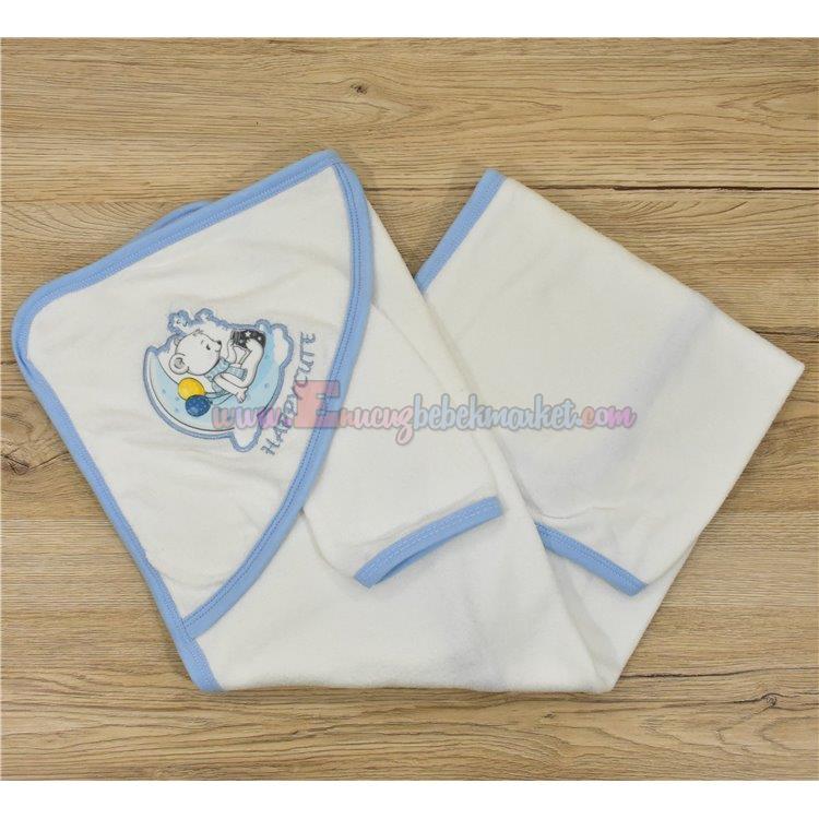 Tanıs 90X70 Cm Happy Cute Nakışlı Bebek Banyo Havlusu Beyaz Mavi