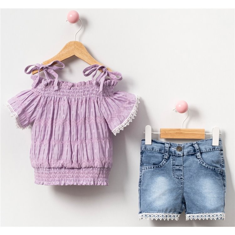 Ünaysi 2-3-4-5 Yaş Fistolu Kot Şortlu Kız Çocuk Takım Lila