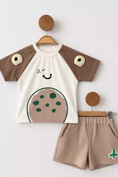 Wow 6-24 Ay Baskılı Waffle Şortlu Bebek Takım Bej