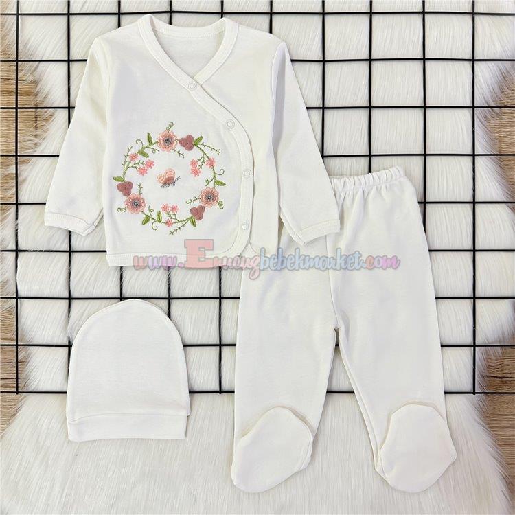 Zem Baby 0-3 Ay 3 Parça Zıbın Takım Çiçek Nakışlı Krem
