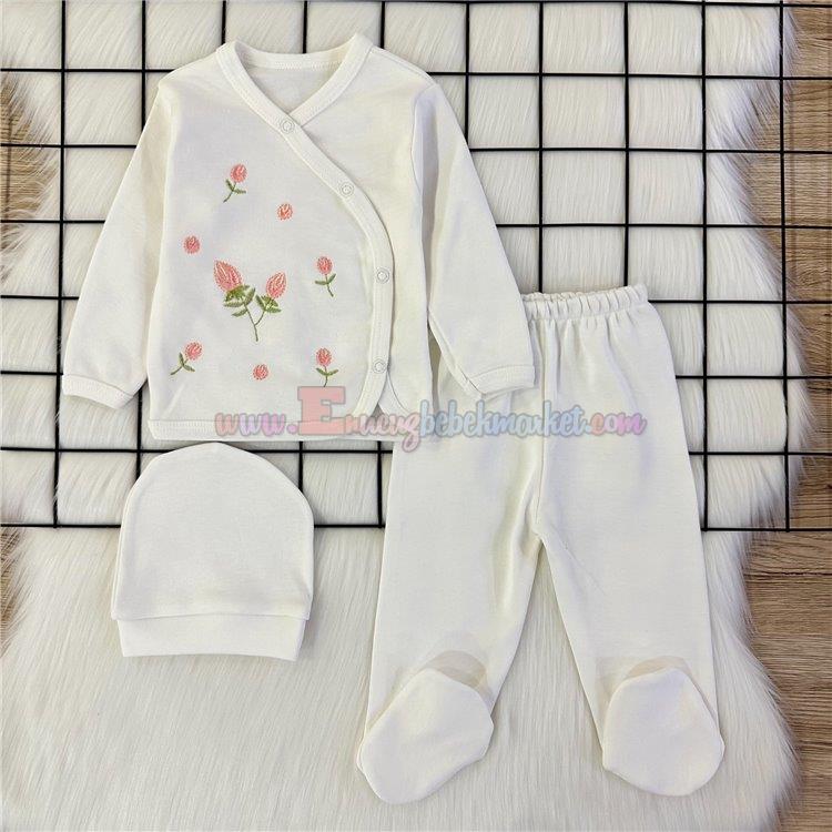 Zem Baby 0-3 Ay 3 Parça Zıbın Takım Gül Nakışlı Krem